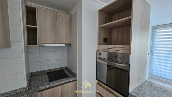 También encontrarás una cocina equipada con barra desayunadora, amoblada con encimera, horno eléctrico y campana.