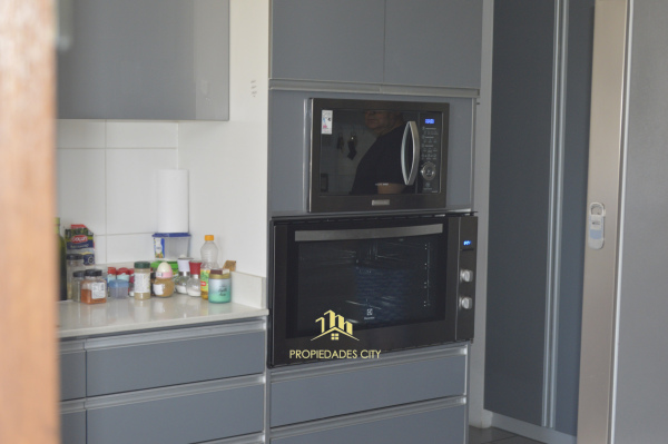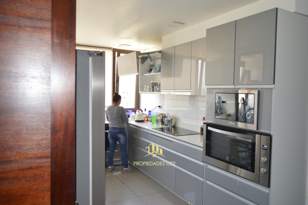 Moderna cocina amoblada, con comedor de diario y equipada con cocina vitrocerámica, microondas, lavavajillas y campana, despensa, logia independiente, closet para ropa blanca.